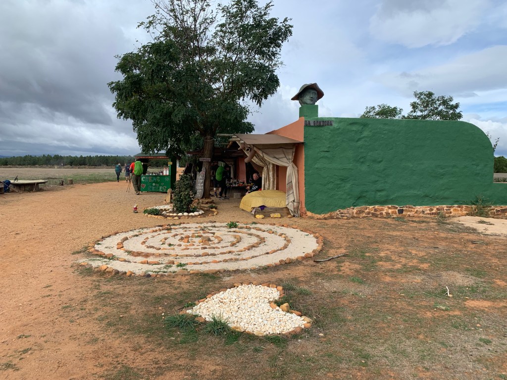 These past few days have taken me through some rugged country. The farmers have a very difficult life tilling these rocky soils. The towns seem ghostly in the early mornings. Who lives here, I wonder. A small donativo I stopped in had skins on the floor as rugs. “Bears?” I asked, because they were quite large. “Javelina” was the reply. The javelina grow big eating corn in the maize fields. During harvest, as they try to escape, the farmers shoot them. Their bellies are full of corn. The young ones make a tasty treat. A donativo is a place where you pay what you can afford. A donation. Along the Camino, there are three types of accommodations: the donativo, where you pay what you can; the albergues, or hostels, where you find bunk beds to accommodate 6 or 8 or 10 people in a room, but some of which also have individual or double rooms often with a private bath; and then the hotels, which, depending on various factors, can be quite nice. This is me with Javier, who helps out at the donativo pictures above. This donativo in the countryside actually offered beds, but was mainly set up to serve food and drinks to the passing pilgrims. This one was nice, offering cheese, dried meats, fruits and melons, chocolate, nuts and more, as well as coffee and tea. They even had Yerba mate, as I was advised later by Christian, a pilgrim from Argentina.