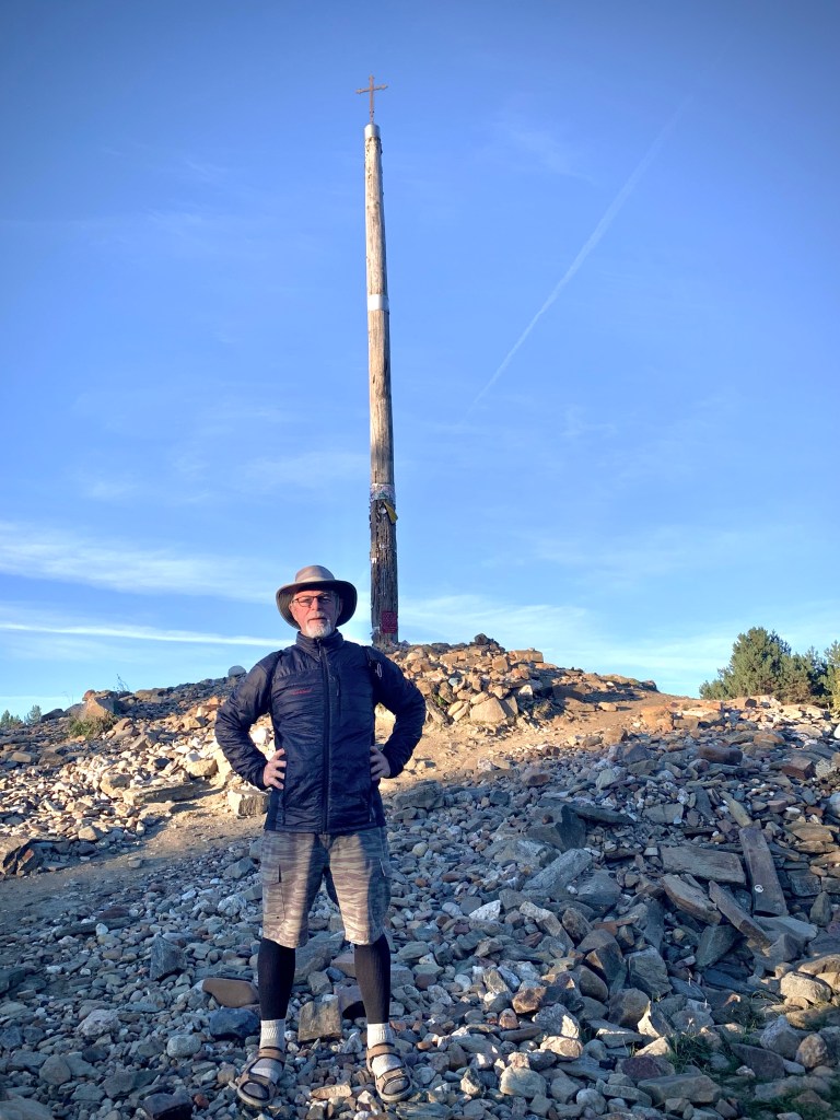 I hastened along my way, stopping for a coffee and Kim’s cake in Foncebadon before continuing on to the Iron Cross to deposit my rock which had travelled with from the Pacific Ocean near Encinitas. The day was lightening so I left my broken glasses in my pocket and went along my way.