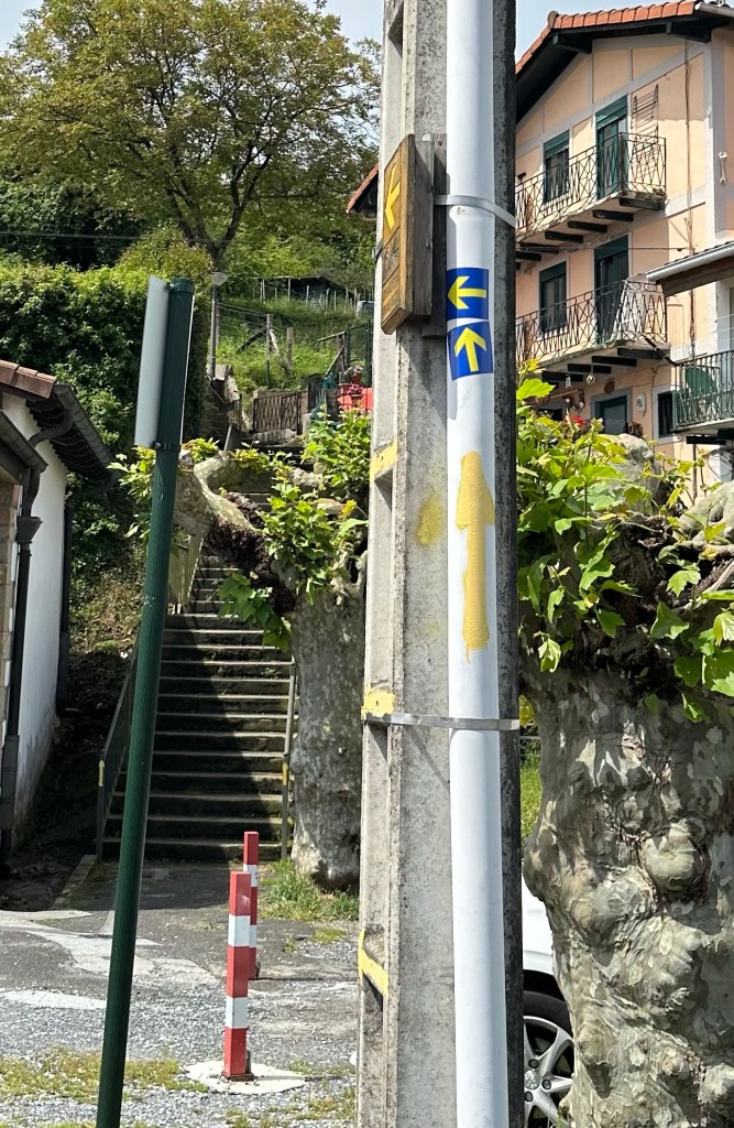 Day One was a very long day. It started on Thursday at 6 am in Houston and ended up on Friday at 6 pm in Pasaia at the Donibanea Hotel. I arrived at San Sebastián airport, which is actually located in Hondarribia, next to Irun, the Basque city next to France and the official start to the Camino de Santiago del Norte. I left the airport and asked a friendly soul where the Camino was. “Right there!” he said, pointing to a stone staircase adorned with yellow arrows across the street. He was quite proud that the local chapter of the Amigos of the Camino had installed plaques and painted arrows marking the way.