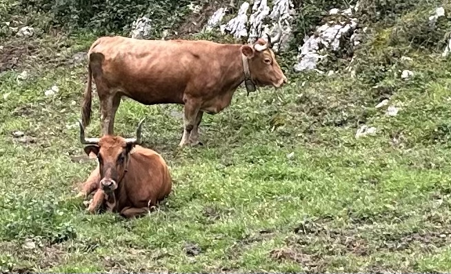 Today started out well with generally good trails but it was uphill to about the halfway point. I noticed more people on the trail today. We lunched midway through our trek with Joel and Anny from Quebec, whom we had forest met at breakfast. We also came across a breed of cattle known as larrebeixac, or the wild cattle of the Geopark coast. In the past, these indigenous cattle were brought down to the towns to celebrate in their festivities. Today, they are protected and live in wild.