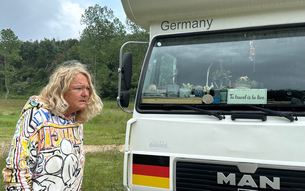 The trail led close to the coast but there were no cliff side paths today. At one point, I saw a large truck with the names of cities from all over Europe and the Middle East. I knocked on the door and Antje, or Ann, a German woman, answered. She had been traveling for years in her home on wheels. She gave me a scallop shell.