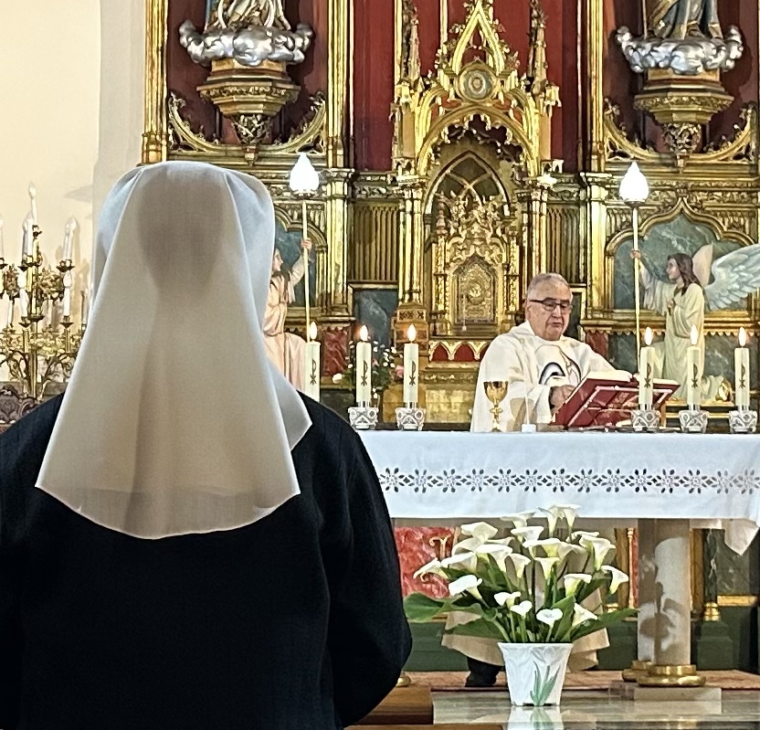 On the way out of town I noticed a chapel with door open. I walked in, hoping to sit for a few minutes of peaceful contemplation. Instead, I found that the Mass had just started. I sat there until it was over, and a little longer listening to the nuns singing songs whose melodys were vaguely familiar.