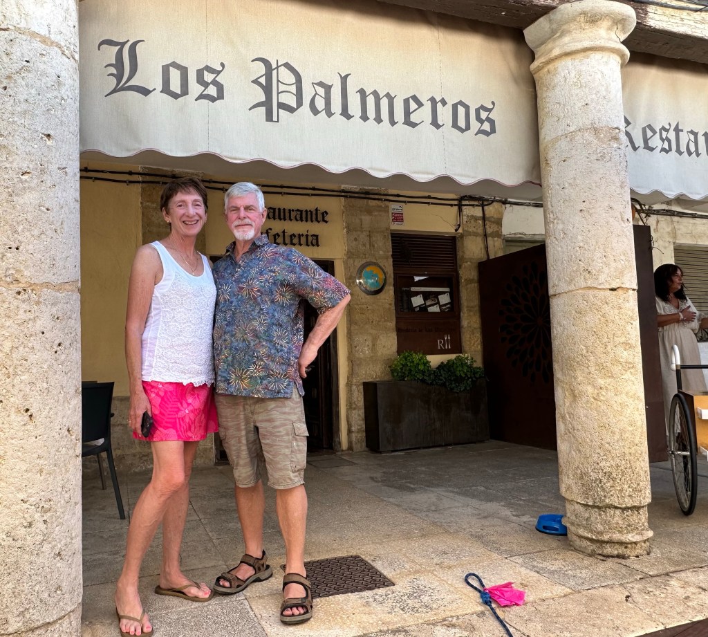 It was nearly 90 degrees by the time we reached Fromista and Sra. Mila welcomed us to the Hostal Camino de Santiago with our arrival beer – a couple cans of cold Mahou. We celebrated Paula’s achievement with lunch at Los Palmeros, an upscale restaurant in Fromista. We had a great meal but the most unusual dish was the gazpacho: it was served on a scoop of tomato and basil ice cream. Perfect for the hot day!