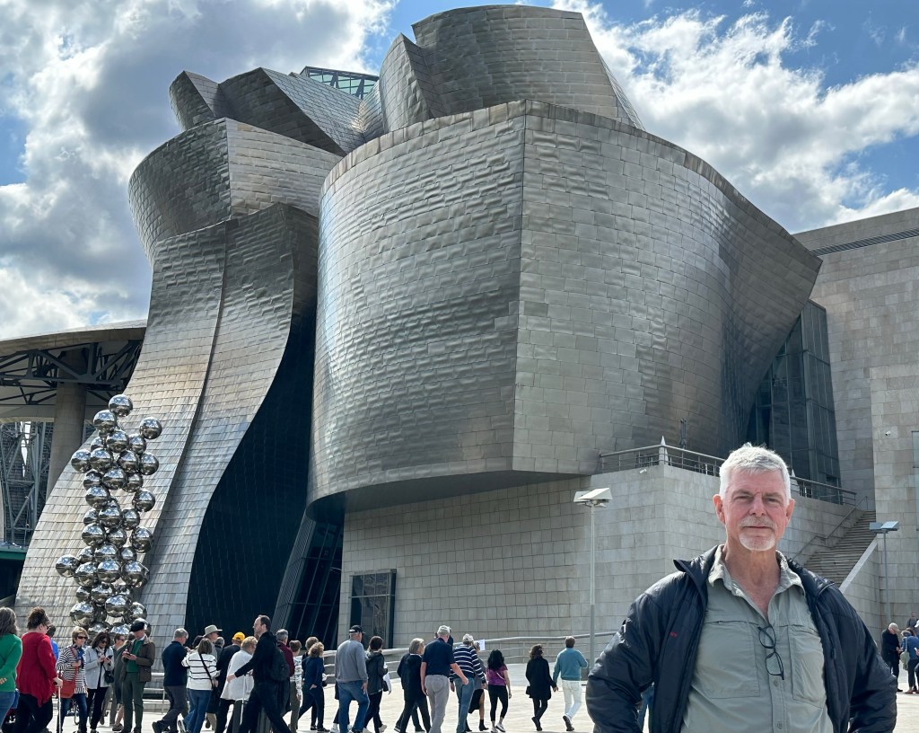 I had my coffee at a nice place down from the Carlton hotel and then Peter and I visited the Guggenheim. We stopped by Bilbao’s Museum of Fine Arts along the way and then walked around the outside of the Guggenheim which was surrounded with tourists, buskers, and trinket salespersons.